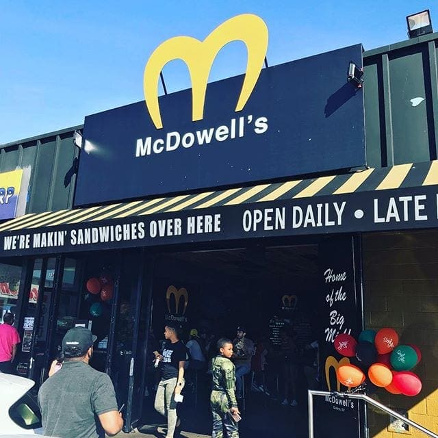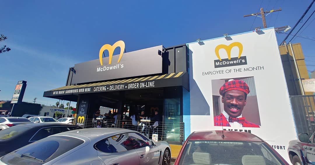 Pop culture is embracing the ’80s for Halloween this year – both the Today and Good Morning America personalities dressed as iconic ’80s celebrities, movies, and TV shows. But one Hollywood restaurant is stepping up their Halloween game, and it will make your Soul Glo! Fat Sal’s Sandwich Shop is now emblazoned with the Golden Arc’s and has transformed into Coming to America’s McDowell’s restaurant, complete with the noted Scottish tartan uniform and a menu that takes a foodie spin so a certain red-haired clown can’t make any copyright claims.
